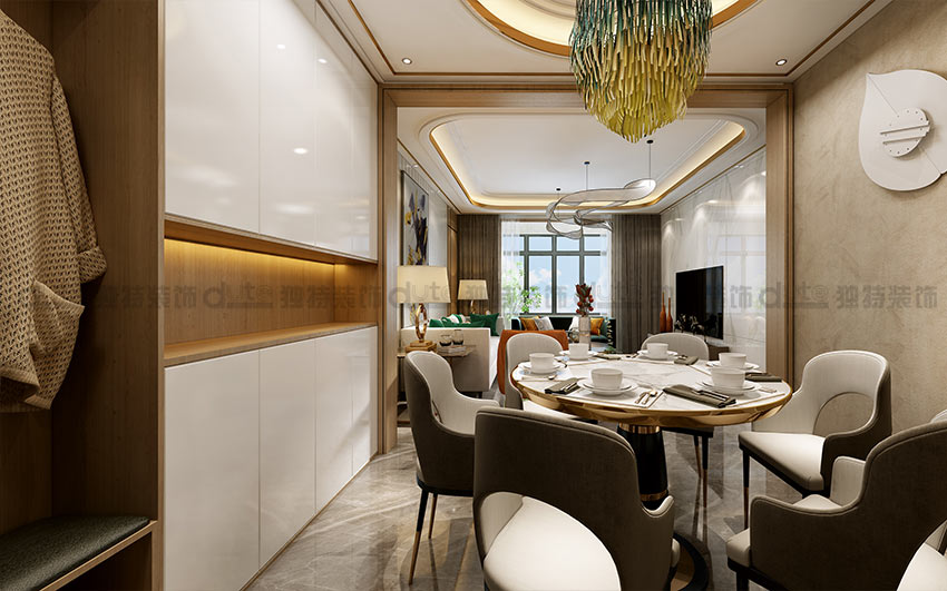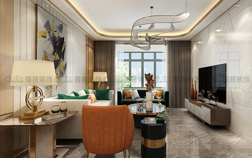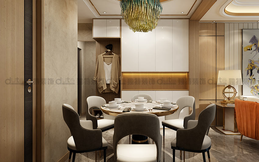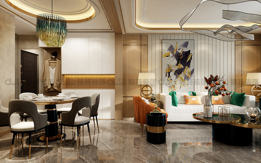 設(shè)計(jì)說(shuō)明:本案以港式輕奢風(fēng)格出發(fā),在充分展示空間的前提下,對(duì)材質(zhì)、空間、色彩有著嚴(yán)格要求,將精心定制極具品味的藝術(shù)品融匯在沉穩(wěn)大氣的空間里,流露出精致尊貴的氣質(zhì)。在設(shè)計(jì)中,在原有硬裝的原木色、咖色的基調(diào)里加入愛(ài)馬仕橙和金屬色作為點(diǎn)綴,讓整個(gè)空間色彩豐富鮮亮,一下就抓住欣賞者的眼球。在陳設(shè)物件中引入金屬和水晶材質(zhì),使整個(gè)空間愈加奢華。此外,家具上還增加了精致的絨布、皮革和不銹鋼裝飾,在細(xì)節(jié)的設(shè)計(jì)上精益求精。