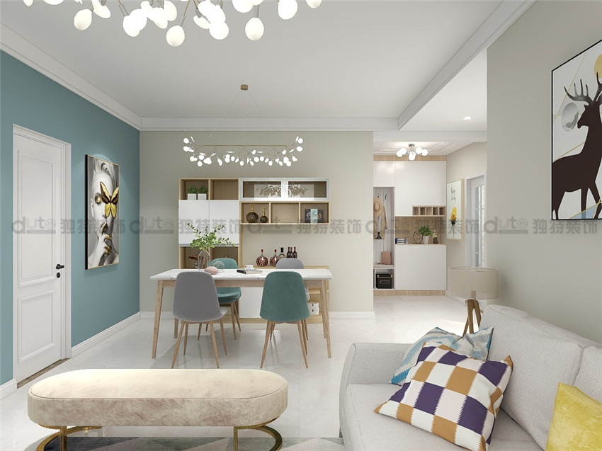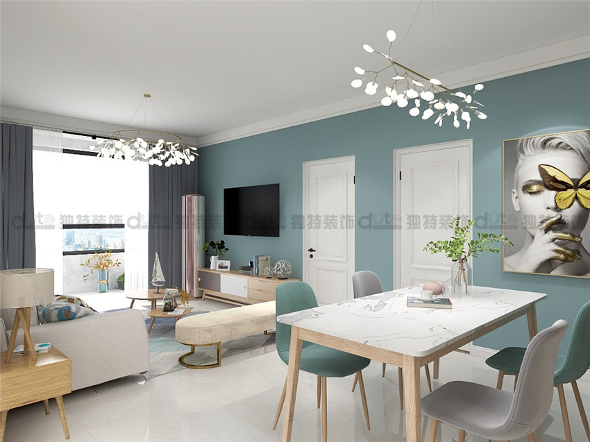 案例說明:本案采用簡單時尚的設計理念,客戶常住人口為三口之家,父母偶爾過來,結(jié)合原木色的家具套色,使整個空間有了原生態(tài)的感覺,用色大膽,電視墻采用藍綠色做為主色調(diào),不僅可以劃分區(qū)域,還能突出亮點。